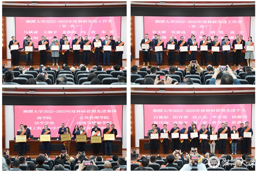 陳旭和鄧國軍分別宣讀了我校2024年度高價值專利培育項目名單和《關于表彰湘潭大學2022-2023年度科研先進工作者、科研管理先進個人和科研管理先進集體的決定》。經公開征集、通訊評審、會議評審,計算機學院·網絡空間安全學院鄒娟教授《基于多種群交替進化神經結構搜索圖像識別系統的研發與轉化》等7個研發團隊的技術遴選為2024年高價值專利培育項目。機械工程與力學學院馬秋成教授等20人榮獲科研先進工作者,科技處白艷松等10人獲評科研管理先進個人,商學院等6個單位獲得科研管理先進集體。校領導為獲得榮譽的集體和個人頒獎。