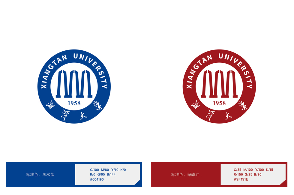 湘潭大學(xué)校徽有“韶峰紅”和“湘水藍(lán)”兩套標(biāo)準(zhǔn)色,總體設(shè)計(jì)簡(jiǎn)約而不簡(jiǎn)單。“韶峰紅”與“湘水藍(lán)”來自校歌“韶峰高,湘水長(zhǎng)”。“韶峰紅”取自偉人故里韶山,是主席銅像廣場(chǎng)上飄揚(yáng)的紅旗與巍巍韶峰交映的顏色,彰顯著湘大人堅(jiān)定勇敢與自強(qiáng)不息。“湘水藍(lán)”取自湖南的母親河湘江,清晨的湘江靜謐悠長(zhǎng),默默地守護(hù)著三湘大地,寓意著湘大守護(hù)著萬千學(xué)子成長(zhǎng)成才。